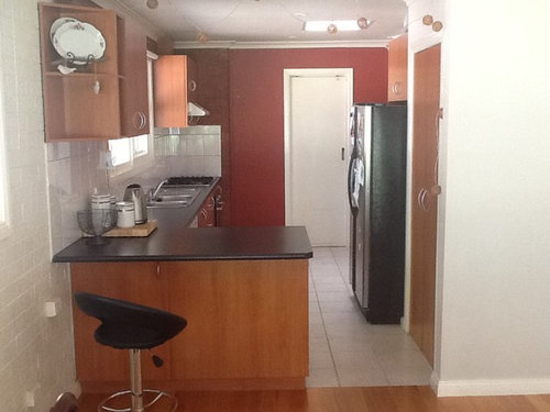 if you reverse your kitchen bench like suggested by Designer Guru perhaps you can move that fridge to the corner ie where the stool is ? then the fridge can be by itself and not in anyone's way? easy to access too?