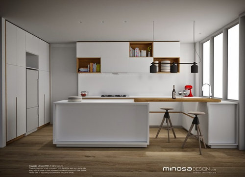 Small kitchen spaces are sometimes self explaining as the room size and window location sometimes dictates where appliances have to go, these elements can really dictate final layouts. and this small kitchen was/is no different but the success of this small kitchen comes down to the creative solutions offered to the eat in element and the use of wood along with a few details that have created a very elegant, refined and well layered kitchen design. (Minosa Design)
