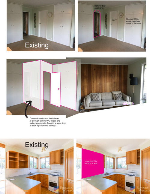 We are considering an alcove area to contain the door to the wet area, keeping the kitchen/dining 'separate'. An idea is to 'extend' the hallway by removing the door and creating an arch (the hallway also has arches). We are happy to lose the BIR. And ok to reconfigure bathroom/laundry within plumbing limits.