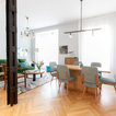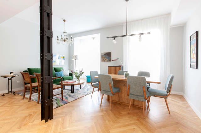 Photo of a mid-sized transitional open plan dining in Madrid with white walls, medium hardwood floors and no fireplace. — Houzz