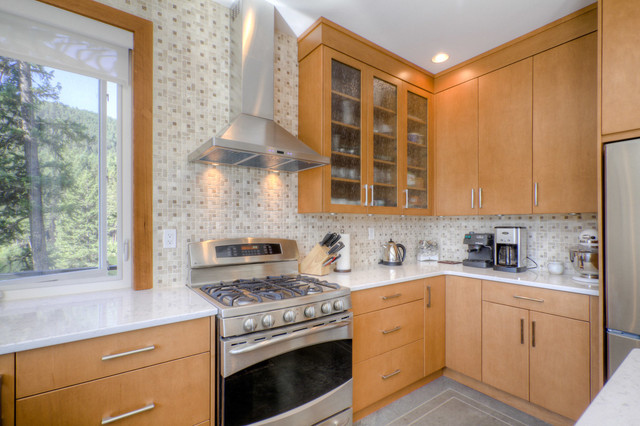 Design ideas for a large transitional u-shaped separate kitchen in Other with an undermount sink, flat-panel cabinets, light wood cabinets, quartzite benchtops, beige splashback, mosaic tile splashback, stainless steel appliances, concrete floors, with island, grey floor and beige benchtop. — Houzz