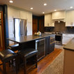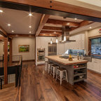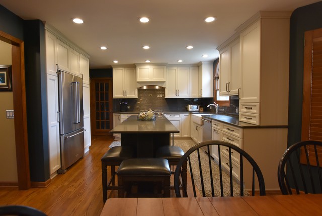 Mid-sized transitional u-shaped eat-in kitchen in Chicago with an undermount sink, recessed-panel cabinets, white cabinets, quartz benchtops, grey splashback, glass tile splashback, stainless steel appliances, medium hardwood floors, with island and brown floor. — Houzz