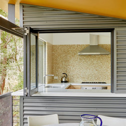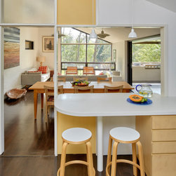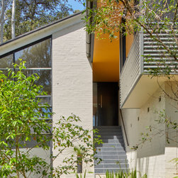 The bedroom wing creates a clearly-defined entrance to the home, between the new and the old, highlighted by the yellow eaves. The interiors have been updated, incorporating some of the unique details of the original, such as timber paneling, glass partitions, clerestory windows and timber handrails. The house is filled with natural light and the tree-top surrounds are as much part of the interior as the exterior.