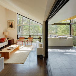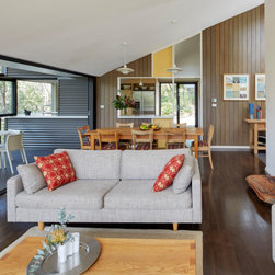 The original house was designed by Peter Johnson some time in the early 1960s. Alterations and additions were completed in 2012 and pay homage to the dramatic roof lines, materials and relationship with the landscape of the original house.