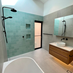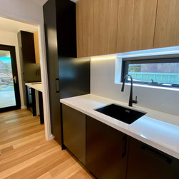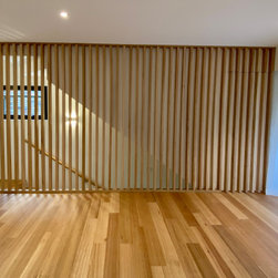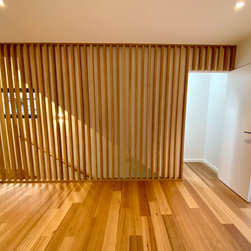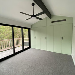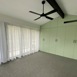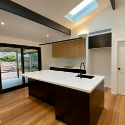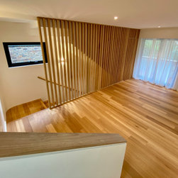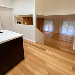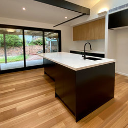 The clever design by Chris from Iron Bark Architecture encompassed some layout and structural changes which opened the living space to create a more light and free flowing area. Completing the family room is the feature blackbutt timber wall which contains a concealed door leading to the master suit.