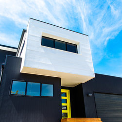 This beautiful NSW South Coast home is a combination of the Box Modern and Mixed Cladding looks. The part of the upper storey in white James Hardie Stria Cladding is nicely cantilevered over the front door. The darker coloured walls are James Hardie's Axon Cladding sheets with the 133mm smooth profile giving the look of vertical joint timber.