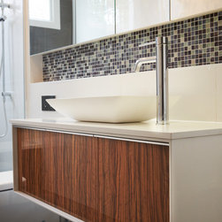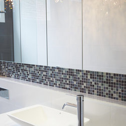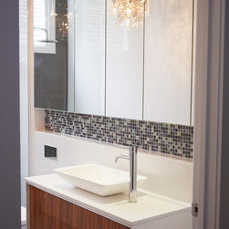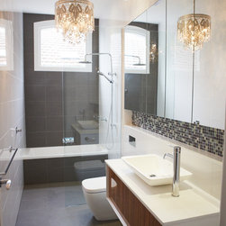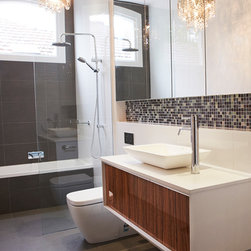 How do you fit all the luxury and practicality into a limited bathroom space? Apply premium solutions that make the most of the available room! Using careful design and space-conscious installation, Bathtime Bathrooms transformed this family bathroom into a dream room where everyone’s needs are met with style. Using a drop-in bath, glass screens, walk-in shower base and wall-mounted toilet, we created separate areas that flow from one to another. The vanity unit features a stylish hand basin and silver tapware adds a shine to the room. Mosaic tiles give a splash of colour above the vanity unit and the mirrored storage cupboards give plenty of room to capture family smiles. Great usage of light from the window at the end of the room, which reflects off the shiny surface of the wall tiles, the glass petition and vanity mirrors makes this bathroom feel clean and bright. The towel rail is conveniently positioned above an existing heating vent to keep towels soft and fluffy. There’s even room for a chandelier adding character and a stylish finish to the room.