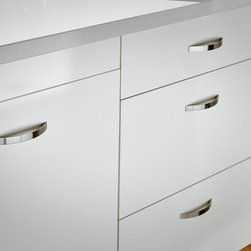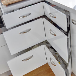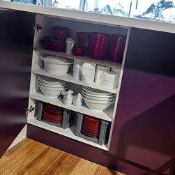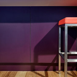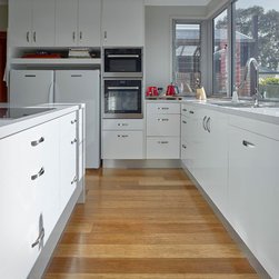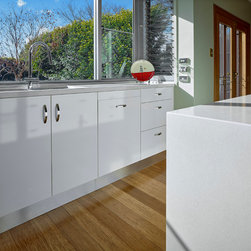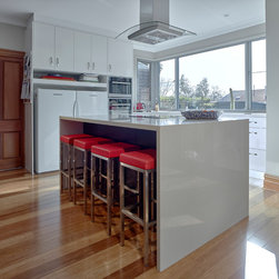 A classic white sheen finish with a splash of colour on the island front was used for the joinery. It features a pull out two tray and space corner drawers for extra storage and convenience. A Caesarstone benchtop in white shimmer with waterfall ends rests in the middle of the room, with some stools that add an extra pop of colour! Floating floors complete this classic modern look.
