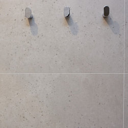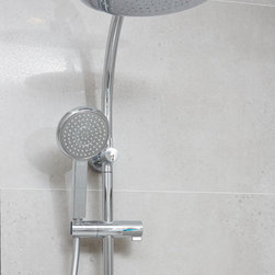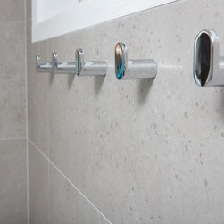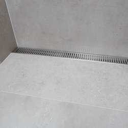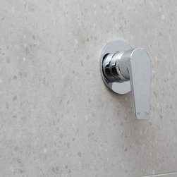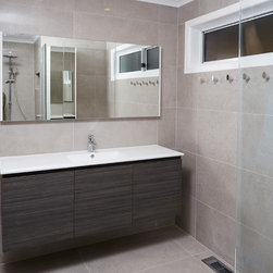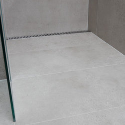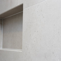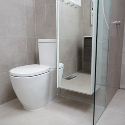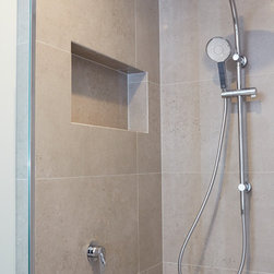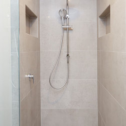 Italian Tortonia Gris 450mm x 900mm wall and floor tiles certainly make the room look very smart. Two recessed niches keep lotions and shampoos on hand in the fully tiled, walk-in shower.