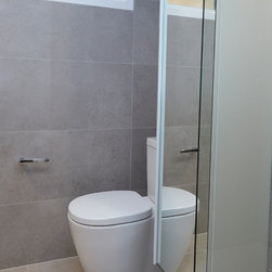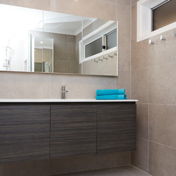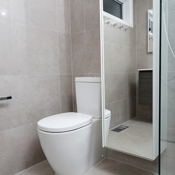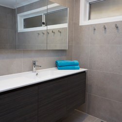 The project included adding a toilet to the room and installing a new Stegbar window to improve light levels. This bathroom with its smooth lines, advanced fittings and quality tiles really does look very posh.