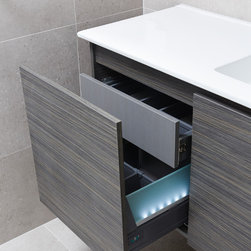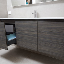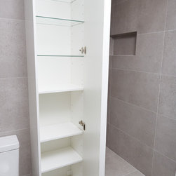 Other smart features include the water drainage from the shower and LED lighting in the vanity drawers. A conveniently located, wall-mounted tallboy cupboard adds storage shelves and a full-length mirror on the door. The smooth lines of the hand basin add style to the modern, streamline vanity.