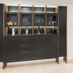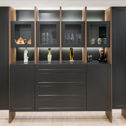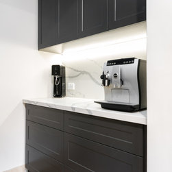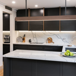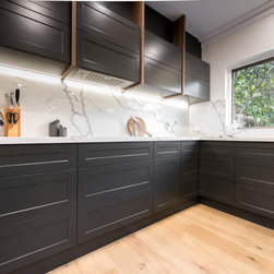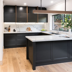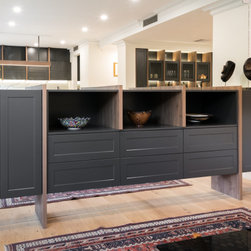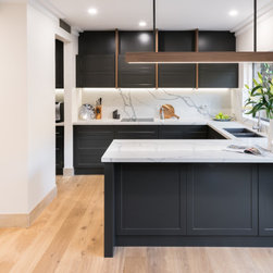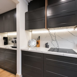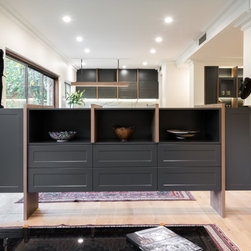 A city renovation to add a walk in pantry to kitchen, where ovens and fridge are also housed. Joinery to the adjoining living room and dining spaces were designed to match this unique design!