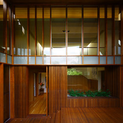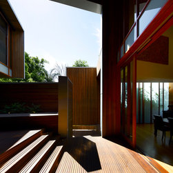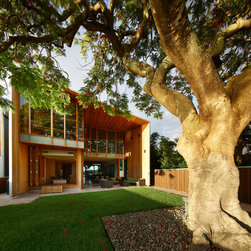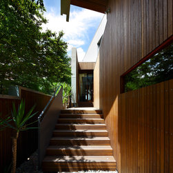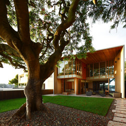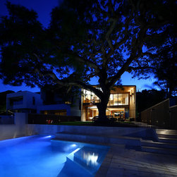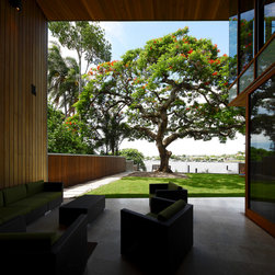The long thin 13 meter wide site is located between two key public spaces, namely an established historic arbour of fig trees and a public riverfront boardwalk. The site which once formed part of the surrounding multi-residential enclave is now distinquished by a new single detached dwelling. Unlike other riverfront houses, the new dwelling is sited a respectful distance from the rivers edge, preserving an 80 year old Poincianna tree and historic public views from the boardwalk of the adjoining heritage listed dwelling.