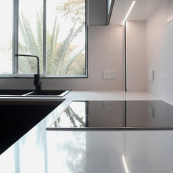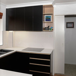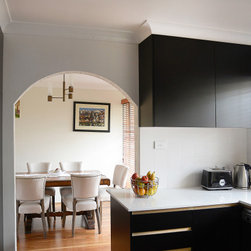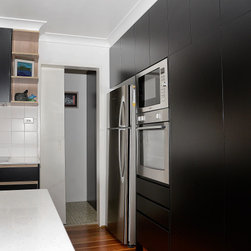 Full of natural light, we took advantage of the bright space allowing the use of dark joinery. The classic black and white palette is complemented with the addition of distinctive timber highlights, that lend the kitchen a warm and inviting atmosphere. The end result is a kitchen that is both bold yet timeless, and is sure to be the centrepiece of any home.