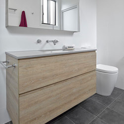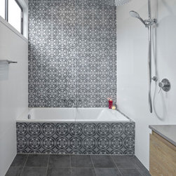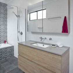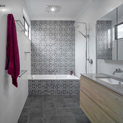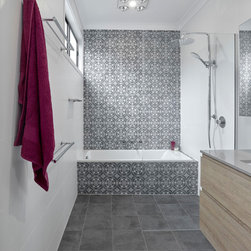 Most notably, three disproportionate rooms have been effectively re-designed to offer three functional spaces. As a result, a moody yet relaxing ensuite, now sits aside the master bedroom in a ‘hotel feel’ configuration. The adjacent laundry is now filled with bold colour and inspired pattern to compliment the feel of the existing home, with a substantial increase in usability. Artisan tiles are used to give each space it’s distinct personality while wood grain laminates help soften the zones. A complete transformation in both style and day to day routine for this growing family.