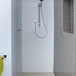 Dark wall tiles on the back wall contrast beautifully with white gloss tiles on the side walls and help give the impression of an elongated space. The tiles were laid horizontally to increase this perception and add a sense of proportion. An existing skylight was retained with a new window and awning installed together with a three-in-one unit for heat and light.
