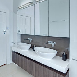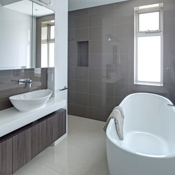 With the aim to include a separate shower and bath as well as a decent-sized vanity and toilet, the challenge was to create a bathroom that was minimalistic and contemporary with a calm, relaxing ambiance with enough space to incorporate all the items on the owners’ wish list. To give the impression of a larger room, large format tiles were used and the tile line was taken right to the ceiling. Square-look accessories and tapware enhance the modern outlook of the bathroom while the wall-hung, double-bowl vanity is a must during the busy morning rush.