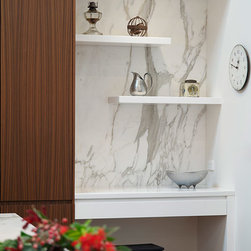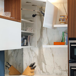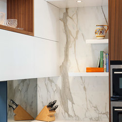 The study nook between the large American Walnut Veneer pantry and the atrium wall looks anything but bookish with its floating marble shelving. This kitchen proves compromise on style or functionality is not necessary when you have great design.