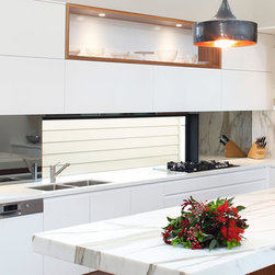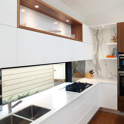 The workspace and sink area is topped in Snow Caesarstone and features mirrored splashbacks that reflect the opposite view from the atrium, adding depth and interest to the kitchen area. The central island of American Walnut veneer and 100mm thick Midrange Iron Lace Marble is beautifully balanced by dropped stainless lighting, while the Vivid White cabinets above the sink are broken by a gorgeous display recess complete with lighting and finished in matching veneer.