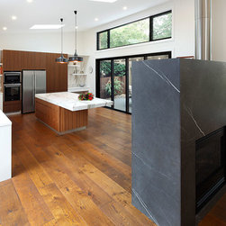 Nestled between a wall of glass that leads onto a fantastic atrium and an imposing feature fireplace, this galley-style kitchen combines inspired attention to detail and traditional, modern and contemporary design elements to create minimalist space that delivers on style and functionality.