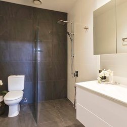 My clients live in a warehouse apartment and wanted an industrial design to fit in with the look and feel of the building. They love clean lines, no clutter and classic modern design. The floor tiles, running up the shower wall has gorgeous movement within it, so I kept it simple with a soapstone white tile for the other areas as not to make it too busy.