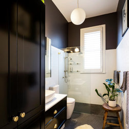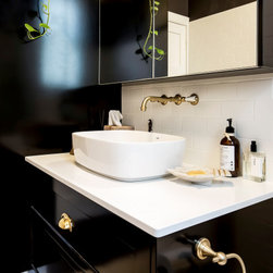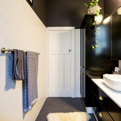Note the use of black for the wall colour above the tiled area. This really sets this bathroom in a class of its own and perfectly balances the black floor tiles and cabinets, with the white ceiling and wall tiles.