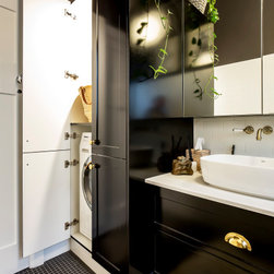 This client's love for black and white was carried through from the kitchen to the bathroom with integrated laundry.