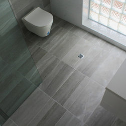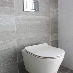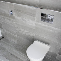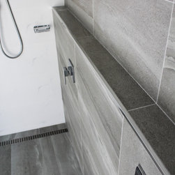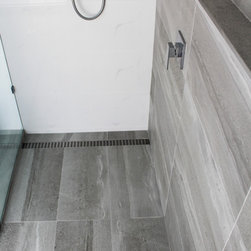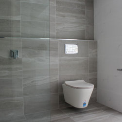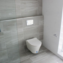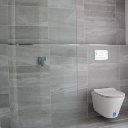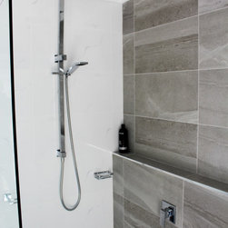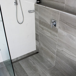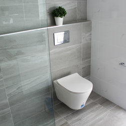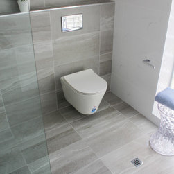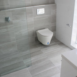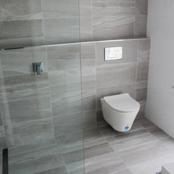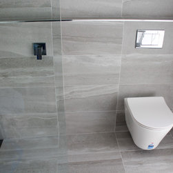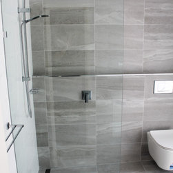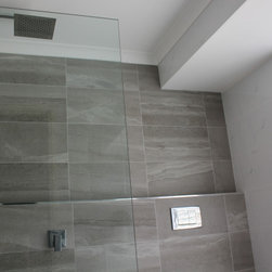 Small Ensuite Renovation, Ensuite Renovation, Grey Feature Wall, Walk In Shower, Toilet In Shower Area, Frameless Shower Screen, Wall Hung Vanity, In Wall Toilet, Internal Toilet, Inside Toilet System, Wall Hung Toilet, Long Wall, Half Built Wall, On the Ball Bathrooms, Bathroom Renovations North Perth