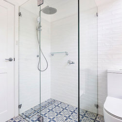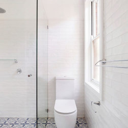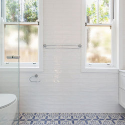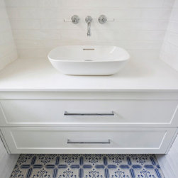 The pretty blue and white Maiolica glazed tiles add a lovely touch, and help to expand the floor area. A mainly white theme for the rest ensures the space will look as spacious as possible. Continuing the style of the kitchen next to this bathroom, the custom-made, Shaker style vanity, with its generous vessel basin and traditional style wall taps, completes the look.