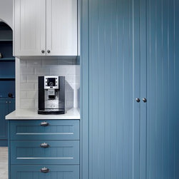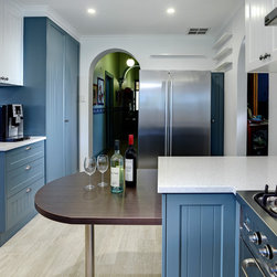An alluring combination of texture and colour, paired with a contemporary timber look, makes quite an impression in this spacious kitchen. Transformed from a heavy timber kitchen, light overhead colours and darker base cabinets form the foundation of a visually larger space. The whitewash timber-look floor tiles lift the room, offering a luminous, tactile realism in harmony with the bevelled subway tiles and Shaker-style cabinetry. LED downlights add to the radiance. Maximum storage was a must-have, so we selected a range of Blum products to utilise every nook and cranny: a corner drawer, Le Mans unit, two-tier pull-out for oils and spices, and pull-out tea towel and dishwasher drawer. A dedicated coffee-making area was slotted in adjacent to the pantry. The tabletop adds an important social aspect to the kitchen, its curves enhancing the overall flow of the space and adding the final visual treat.