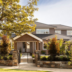 Beautiful streetscape, house facade and entrance. Stone fencing, shingles, gabled roofs, terraced stair entrance