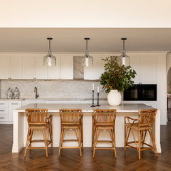 Stone benchtops and splashback, traditional shaker style cabinetry. Traditional yet modern and functional kitchen design.