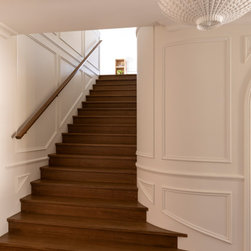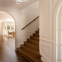 Beautiful staircase design, curved wall and arches, herringbone floors, wainscotting and timber stair treads and risers