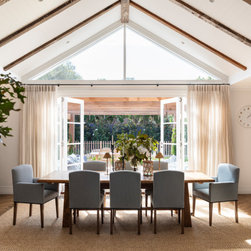 Dining room with herringbone floors, aged timber rafters and VJ ceiling panelling, airy and light