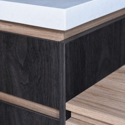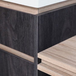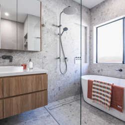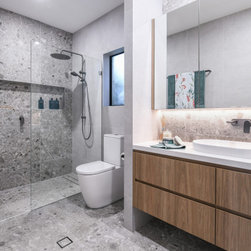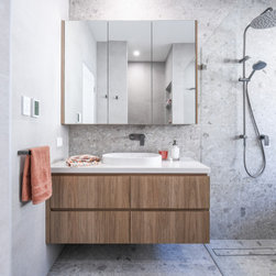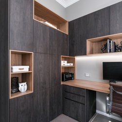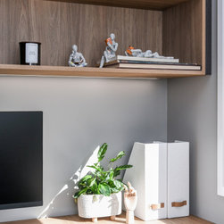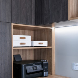 For the home office, we utilised the same Perugian Walnut and Prime Oak Woodmatt joinery, combined with mesh cabinet doors, providing a contemporary and stylish aesthetic. The upgraded bathroom and ensuite boast floating vanities and mirrored shaving cabinets, enhancing the overall sense of space and reflecting natural light.