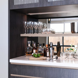 To further elevate the home's entertainment possibilities, we created a bespoke bar area. This area showcases an antique mirrored splashback, which adds a touch of vintage charm and visually expands the space. The wire mesh cabinet doors add a unique texture to the design, making the bar area a standout feature within the home.