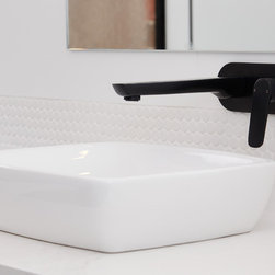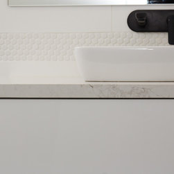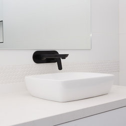 The renovation required the removal of a small window, replaced by a larger version to add more light to the room. Textured feature tiles surrounding the vanity unit add another simple change that adds interest. The shower niche is outlined in black and the black shower head add a dramatic effect.