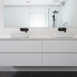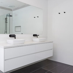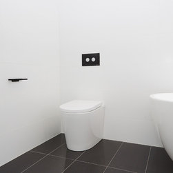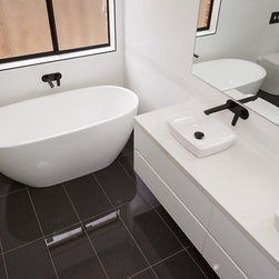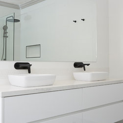 Time for the ensuite to be updated and this couple chose a black and white theme. The matte finish of the tapware and shower fittings contrast with the shine and gleam of the tiles, hand basins and bathtub.