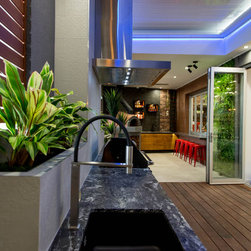 A stunning outdoor kitchen featuring Sensa 'Black Beauty' 80mm Granite Benchtops in Caresse Finish, Matte Black 2-Pack 'Crackle' Effect cabinetry with V-Groove Finger-Pull Doors and Drawers, Franke Kubus Undermount Sink in 'Fragranite Onyx', Pete Evans 316 Stainless Steel Mixer Tap, Beefeater Signature 3000E 5-Burner Black BBQ, Euro Appliances Stainless Steel 120cm Canopy Rangehood, Grey Matt 600x600 Tiles to Splashback, and Merbau Decking to Floor.
