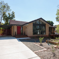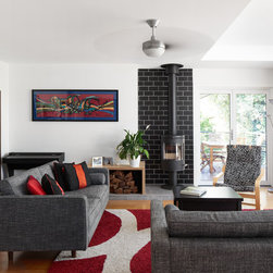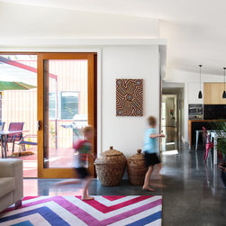 As we often say, the more constraints there are on a project, the more interesting and dynamic the design result will be. This house is a great example of that. The existing home was largely reconfigured internally, with a few ‘pop-outs’ borrowing a little more space under the existing roof line. The main extension in to the backyard is designed to capture the northern sun, and provide excellent connection to the outdoors and various framed views to the garden and trees. The materials and colours are bold and modern to provide an exciting and energetic new space – but they are also textured and rich to connect back to the tangible native landscape and original house.
