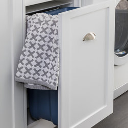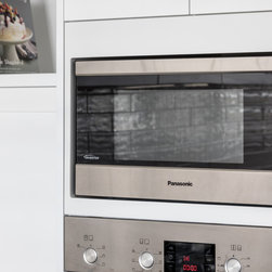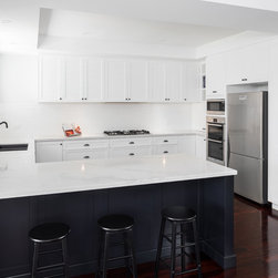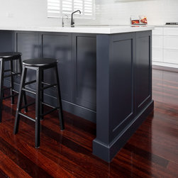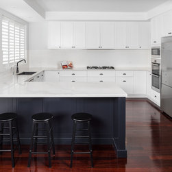 Doors: Shaker sprayed in satin lacquer Vivid White and Antarctic Deep.