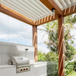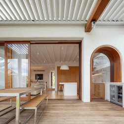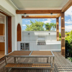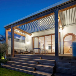 A high level of craftsmanship underpins the project. This is evident in the precision of the oversized timber pergola, the application of textured render over the existing brickwork, and the finely resolved joinery throughout — contributing to both function and finish.