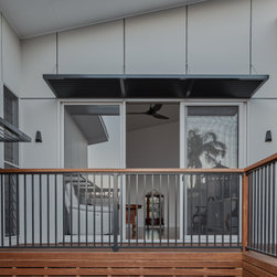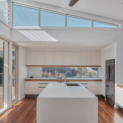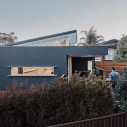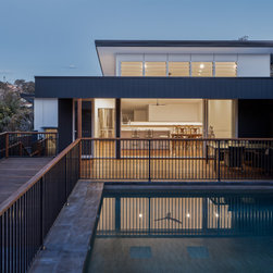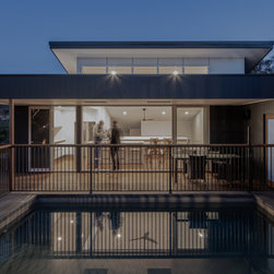 The existing house on this very steep block sat at the bottom of a hill with an imposing driveway and staircase to access it. The clients brief was a renovation that connected them better to the street and the existing pool at the top of the hill whilst admitting more natural light and ventilation into the house.