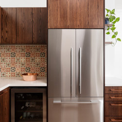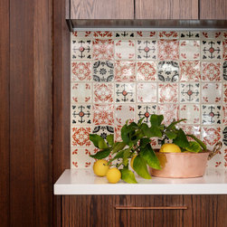 Jane and Ken had recently visited Morocco, and were taken with the tile designs they had seen. So for the benches and splashback, I selected elaborate handmade tiles to form a mosaic-like feature. This was accented by dark American oak joinery and white Caesar stone benches. Finally, I hung copper feature pendant lights above the island, completing the Moroccan feel.