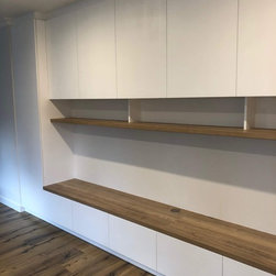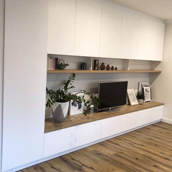 Custom designed and manufactured, built-in entertainment unit. Two pack white matte cabinetry with Nikpol "Halifax Oak" shelving.