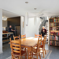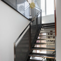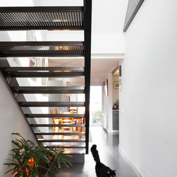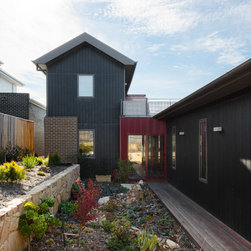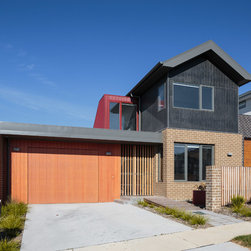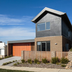 Set on a narrow, sloped block in the new suburb of Casey, this two storey home opens up to its surroundings in unique and surprising ways. Upper storey windows take in beautiful views across the landscape and allow ample northern sunshine to filter through the sculptural steel staircase and penetrate deep into the main living spaces.