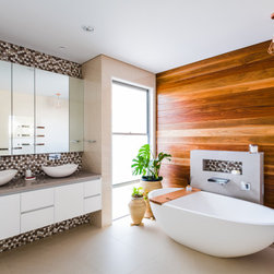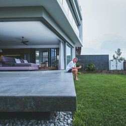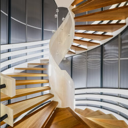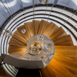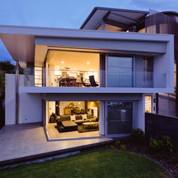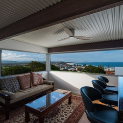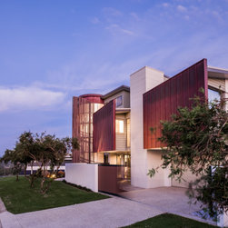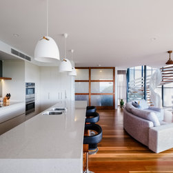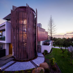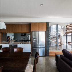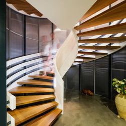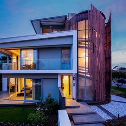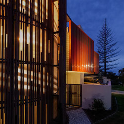 The site informed an eclectic composition of architectural forms. Inspired by a giant nautilus shell, the concept centres around a sculptural helical staircase connecting three levels of living including a one bedroom ‘apartment’ on the first floor for the retired owners, a ‘hose-out holiday home’ for family on the ground floor and a shared ‘observatory / bar’ on the third level. By night ‘the lantern’ stair shields the home from the headlights of a busy intersection and by day the timber battened sculpture shelters the home from the afternoon sun. Copper blade walls are angled to reflect the afternoon sun, frame ocean views and provide privacy from the neighbours. The landscape views of the Border Ranges and Kingscliff Beach are framed by the clean white picture-box of the first-floor living room.