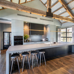 A combination of V-groove joinery in Dulux Wistow and Caesarstone bench in Raw Concrete for an outstanding kitchen design and build by The Kitchen Design Centre.