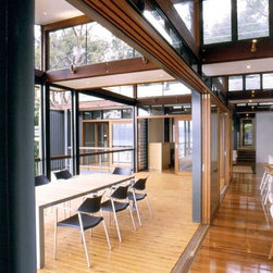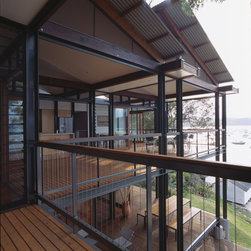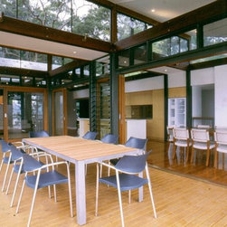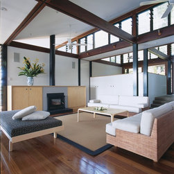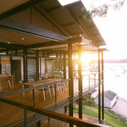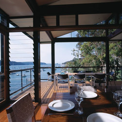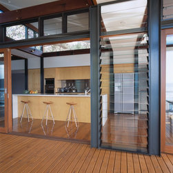 The main living areas are positioned around a roofed deck area that can be semi-enclosed by fly-screens. The deck is a natural extension of the internal spaces, allowing the doors to remain open and the inhabitants to move seamlessly between indoors and outdoors.