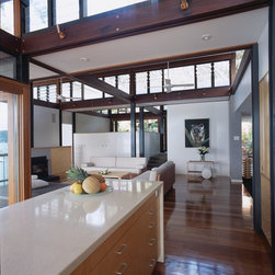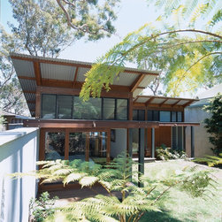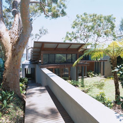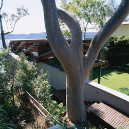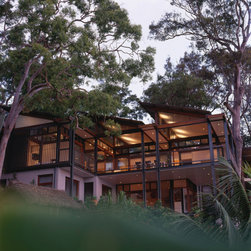 This new home on Pittwater has an L-shaped plan, to capture the best views and aspect to the North. The mono-pitch roofs, mirror the slope of the site, allow for cross ventilation and morning light, whilst revealing the beautiful angophras behind the site.